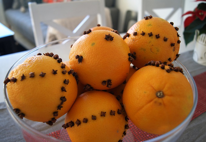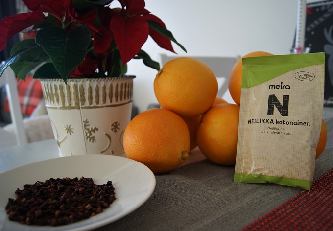Tein myös neilikka-appelsiineja eli oikealta nimeltään pomandereita, mutta se oli taas kerran katastrofi. En tajua miten ne eivät muilla homehdu. Viime vuonna tein sen virheen että laitoin ne suoraan lasiastiaan ja on loogistakin että ne homehtuivat viikossa sillä kosteus ei päässyt haihtumaan. Tällä kertaa laitoin ne roikkumaan viileään ja hämärään kaappiin, kun olin jostain lukenut että näin ne kuivuvat. No kestiväthän ne pidempään mutta homehtuivat silti ja parin-kolmen viikon jälkeen sain heittää ne pois. Vaikka oli ihan kivaa että ne kestivät pidempään, harmittaa että emme päässeet nauttimaan tuoksusta sillä ne roikkuivat koko tämän ajan siellä kaapissa. Viime vuonna sentään tuoksui koko koti viikon ajan. Saapa nähdä jaksanko askarrella niitä enää ensi vuonna. Niiden tuoksu on kyllä vertaansa vailla.