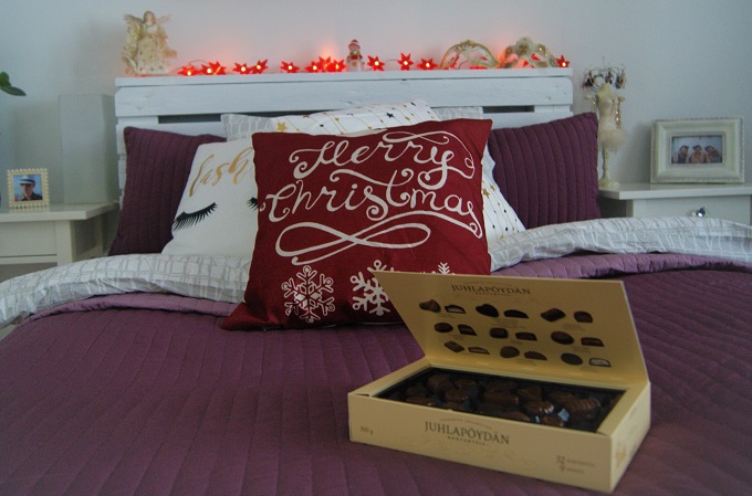 Tämän vuoden askarteluihin kuuluu vielä tyhjät lahjapaketit jotka tein siis täysin ihan vain sisustuselementiksi. Ovatkohan muut näin jouluhöperöitä? 😀 Pidän kuitenkin siitä miltä ne näyttävät ja ne voi laittaa esille vuosi toisensa jälkeen muiden joulukoristeiden tavoin. Toinen sisustusesine mitä hommasin tänä vuonna on ihanat jouluiset tyynyliinat olohuoneeseen ja makuuhuoneeseen. Minä olisin halunnut vielä verhotkin, mutta Samu ei kokenut niitä tarpeelliseksi joten luovuin ajatuksesta. Ehkä hän taisi olla oikeassa.