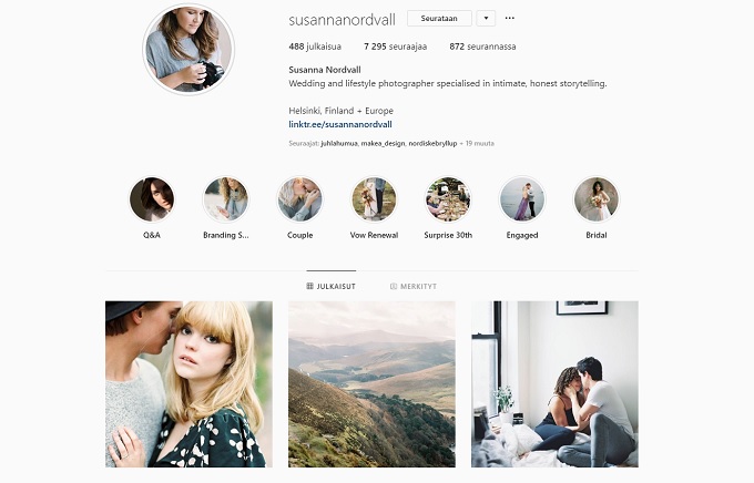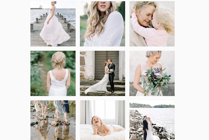 Heti kun menimme kihloihin, tajusin että on aika alkaa etsimään todellisia hääalan ammattilaisia ja Suomen parhaimmistoa kaikilta mahdollisilta häihin liittyviltä aloilta. Tämä siis käsitti myös Suomen parhaat (hää)valokuvaajat. Koska tykkään itse valokuvaamisesta (vaikkakin olen täysi amatööri siinä), olin erityisen tarkka valokuvaajan etsinnöissäni. Minulle oli tärkeää, että oma mielikuvani siitä, miltä valokuvien pitäisi näyttää, kohtaisi valokuvaajan mielikuvien kanssa. Niimpä lähdin etsimään valokuvaajaa Instagramista. Kyllä, Instagramista. Olen huomannut sen olevan paras tapa löytää hääalan toimijoita. Seurasin kaikkia, kenen kuvat ja profiili miellyttivät silmääni.