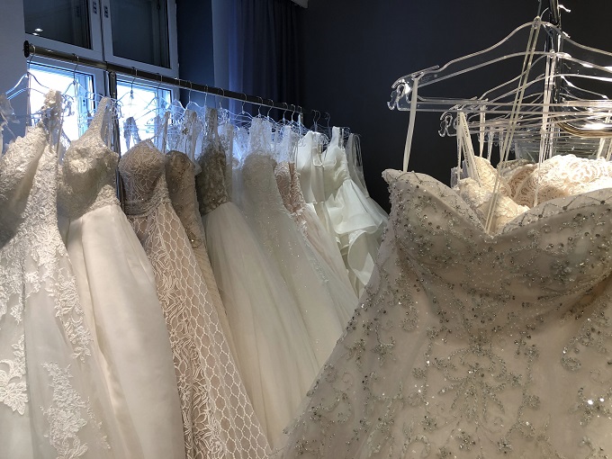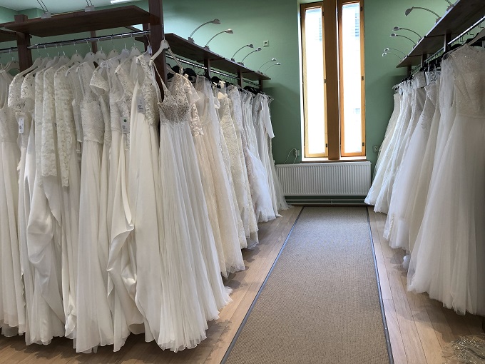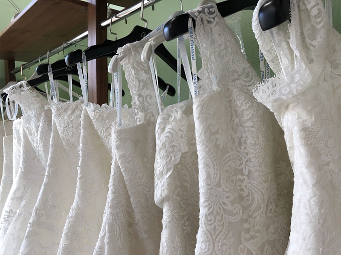 Suurin yllätys oli se, miten hankalaa sovittamisen aloittaminen oli. Olin todellakin häkeltynyt siitä miten paljon erilaisia ja varsinkin samanlaisia mekkoja oli! Alussa sovitettavien mekkojen valintaa vaikeutti myös se, että mekot näyttivät todella erilaisilta rekeissä kuin valokuvissa ja ihmisten tai mallinukkejen päällä. Jos olisin tiennyt paremmin, olisin aloittanut Morsiuspukuliike Glamourista, sillä siellä valikoima oli pienin. Katariinassa saimme ensimmäisenä käteemme noin 6 rinkulaa, joilla pystyimme merkitsemään mekot, joita halusin sovittaa. Saimme rajattua Katariinassa sovittettavat puvut niin, että valikoimassa oli monia erimallisia ja -tyyppisiä mekkoja.