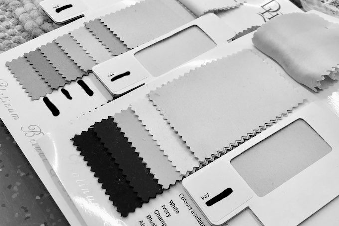 Seuraavaksi siirryimme jo kankaiden valintaan. Olin hetken hieman hämmentynyt siitä, miten nopeasti hyppäsimme seuraavaan vaiheeseen, sillä olin itse vasta hetki sitten 7 kuukauden jälkeen nähnyt ensimmäistä kertaa unelmieni mekon piirrettynä silmieni edessä. Nautin kankaiden valinnasta todella paljon. Välillä valikoiman paljous hankaloitti päätöksentekoa, mutta huomasin, että vähitellen tyylini alkoi hahmottua. Aluksi valitsimme pohjakankaan varmaankin miljoonasta eri vaihtoehdosta. Sitten tuli mukaan päällyskankaiden ja -pitsien valitseminen, joita oli ainakin kaksi miljoonaa erilaista. Mutta olihan se kyllä hauskaa vertailla niitä!