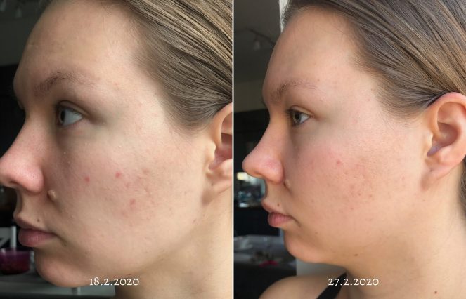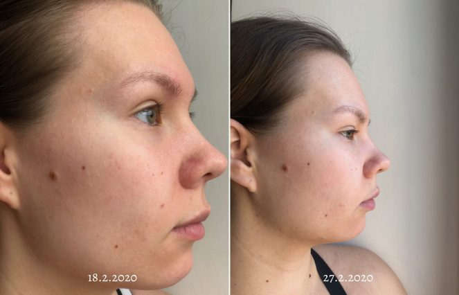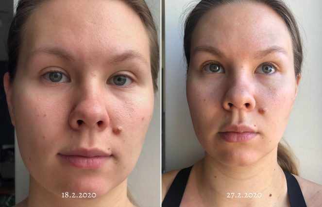 Tässä vielä vertauksena kuvat päivältä 1. ja 10. Sen suurempaa eroa on vaikea huomata, mutta kuvat ja valotus vääristävät hieman. Päivitän teitä ihoni hyvinvoinnista taas seuraavan hoitokerran jälkeen.