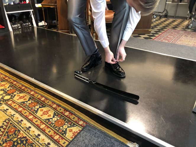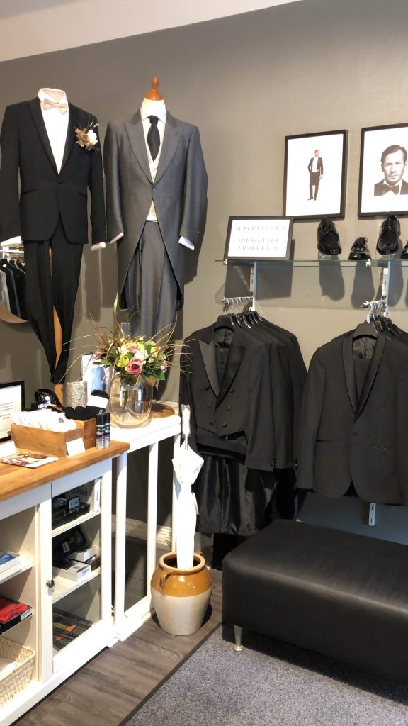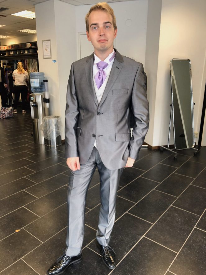 Puvun väri oli ollut meille itsestäänselvä alusta asti. Samulle sopii hyvin kaikki harmaan eri sävyt ja halusimme jotain muuta kuin mustaa tai sinistä. Puvun tyylistä keskusteltiin todella pitkään. Minä olin sitä mieltä, että sen pitäisi olla ehdottomasti smokki, mutta Samu oli perinteisempi ja halusi ennemmin saketin. Kesällä kävimme kokeilemassa pukuja tuossa ihan naapurista löytyvässä Frakkipalvelu NAM -liikkeessä. Totesimme yhdessä myyjän kanssa, että harmaata smokkia tuskin tulee mistään löytymään. Olimme saaneet pienen luennon myös Suitsupply -liikkessä työskentelevältä myyjältä hääpukujen etiketistä. Niimpä päätimme sovitella toisenlaisia pukuja Samun päälle. Frakkiliikkeessä totesimme kuitenkin, että saketti näytti vähän hölmöltä Samun päällä. Takki oli tietysti siis pitkä, mikä sai Samun näyttämään todella lyhyeltä.