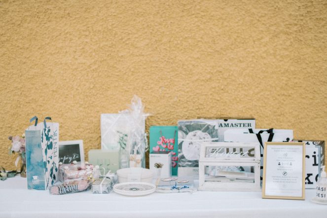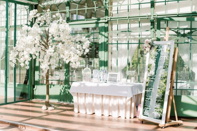 Terassille sijoitettu pöytäkartta ja vieraskirjapöytä olivat lempikohtani koko juhlatilan koristelussa. Olimme saaneet Maison Helsingiltä tuolien vuokraan kaupanpäällisenä valita kukkakaaren tai -puun, joten olin randomilla valinnut valkoisen kirsikkapuun. Se sopikin tilaan todella kauniisti ja olen todella iloinen että saimme sen mukaan pakettiin. Päällisin puolin koristelu oli onnistunut ja toimiva, joten en harmittele sitä enää liikaa jälkikäteen. Tosin, jos saisin mahdollisuuden tehdä kaiken uudestaan, niin tekisin asiat toisin. Minusta tuntuu, että edelleen kukkapula oli todella ratkaiseva tekijä koristelussa. Kaikki kuitenkin toimi hyvin yhdessä ja pääasia oli, että vierailla oli hauskaa.