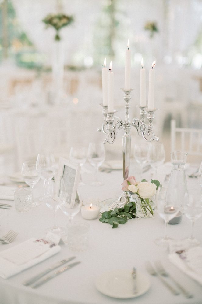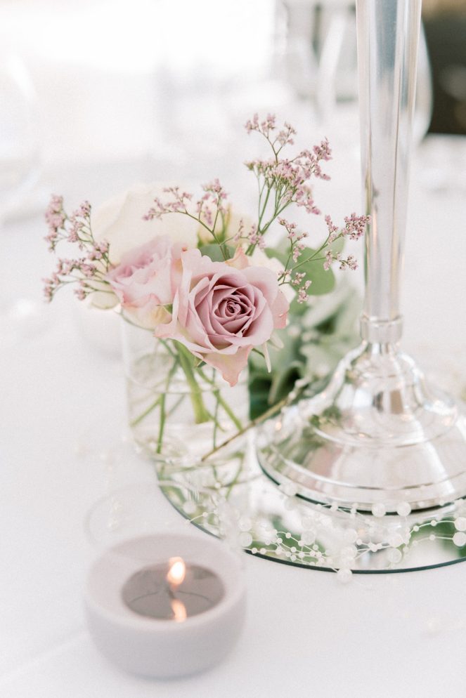 Pyöreiden pöytien kattaus oli suunniteltu tarkasti ja laitoin siitä mahdollisimman havainnollistavat esimerkkikuvat kartanolle etukäteen. Keskikoristeen alle asetimme jokaiseen pöytään pyöreät peililasit. Nämä eivät toimineet ihan toivotulla tavalla kukkapulan vuoksi. Pöydissä oli pöytäkoristeen lisäksi koristeena helminauhaa ja pieniä kynttiläkuppeja. Jätimme kunnolla tilaa varsinaiselle kattaukselle, pöytänumerolle, paikkakorteille ja menu-ohjelma -kylteille.