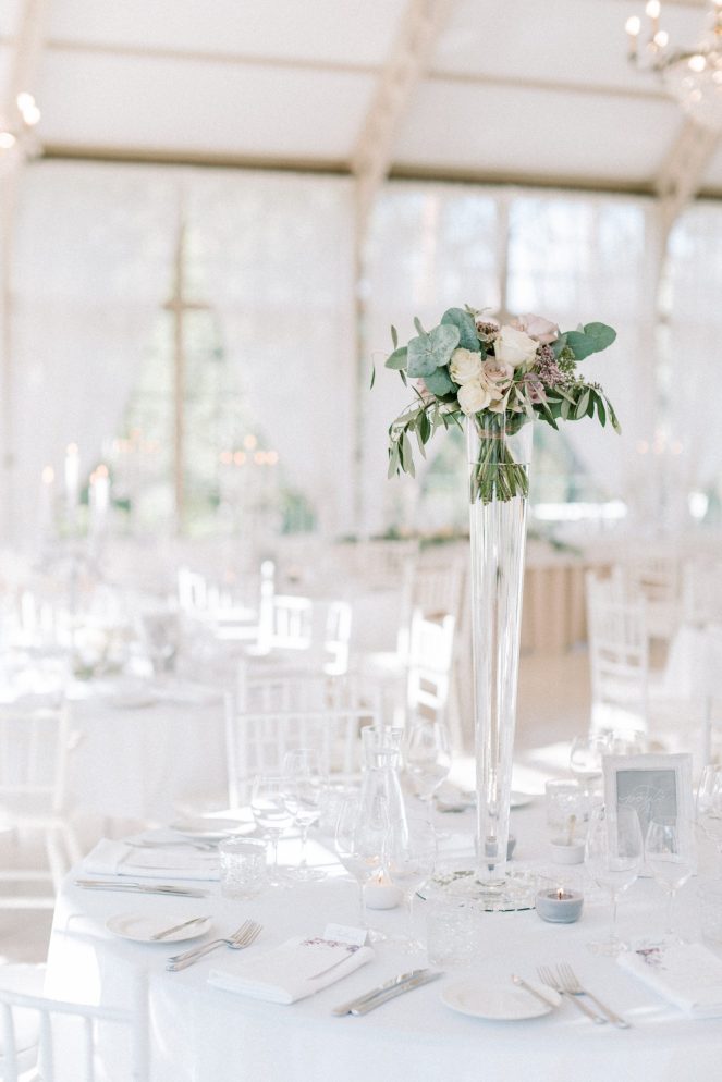 Alusta alkaen tiesin haluavani juhlatilaan pyöreät pöydät, jotka kartanolta pystyi vuokraamaan 100€ lisähinnasta per pöytä. Pöytien asettelu ja koristelu määritti ison osan siitä, miltä koko juhlatilan ilme tulisi näyttämään. Kartanolla oli valmiiksi olemassa käsinojalliset tummat tuolit, mutta koska halusin lasipaviljongin ja hääteemamme vaaleaan ilmeeseen sopivammat tuolit, jouduimme etsimään ne muualta. Kuten olen jo aiemmin blogissani kertonut, löysimme Love me do -häämessuilla täydelliset valkoiset tuolit Maison Helsingiltä jo pari vuotta ennen häitä, jotka päädyimme lopulta vuokraamaan.