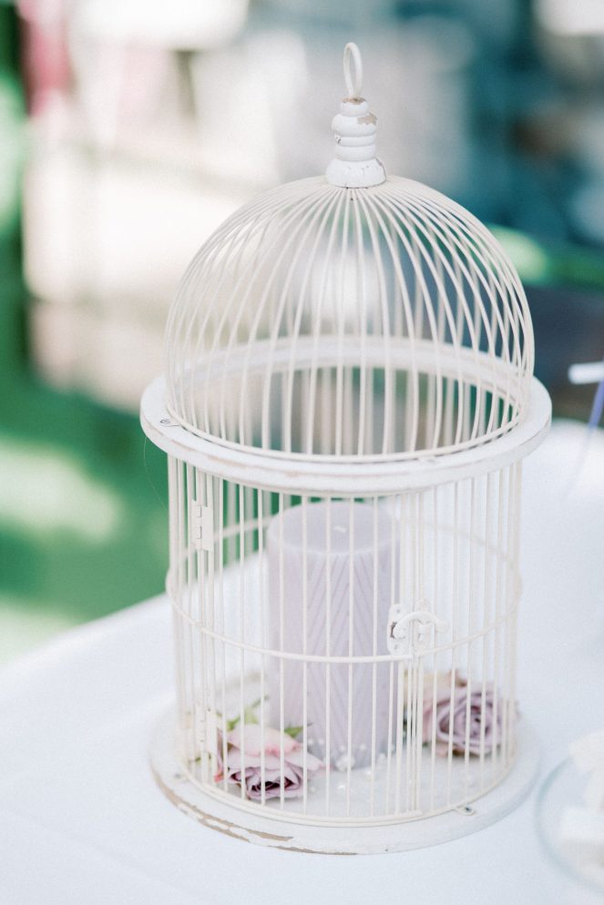 Annen Party & Deco:lta löysimme pienen valkoisen lintuhäkin, joka sopi täydellisesti romanttiseen valkoiseen teemaamme, joten sekin päätyi osaksi koristusta. Vuokrasimme Annelta lisäksi korttilaatikon, johon vieraat saivat pudottaa onnittelukortit ja kirjekuoret, vieraskirja- ja lahjapöytäkyltit sekä baarikyltin kehykset ja siihen sopivan telineen, jotka olivat kaikki samantyylisiä. Meillä oli vuokrassa myös pienet lasipurkit huiskutuskepeille ja korit, joista jaettiin riisi-laventeliseokset kirkolla vihkimisen jälkeen.