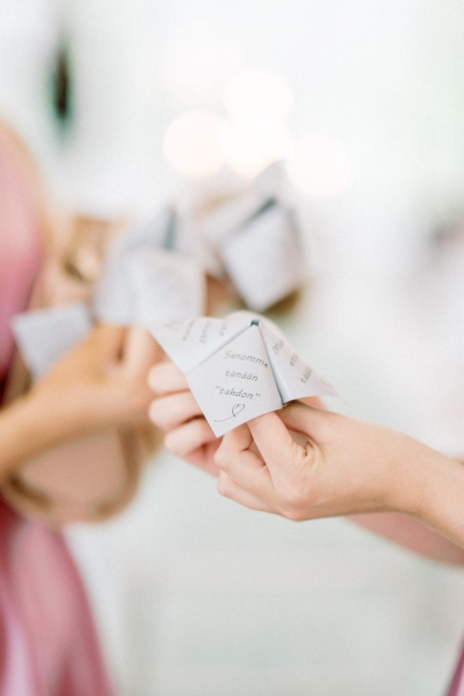 Pöytiin jaoimme vieraille puuhailtavaksi nk. paperikirppuja, jotka äitini oli toteuttanut toiveideni mukaan. Toivoimme, että näistä vieraat saisivat hauskaa ajanvietettä esimerkiksi odotellessaan ruokaa tai kahvittelua. Idean sain Pinterestistä ja se herätti heti nostalgisia tunteita, sillä muistan lapsena askarrelleeni monta tämmöistä. Itse en ehtinyt näkemään pääsivätkö nämä askartelut käyttöön häissämme, mutta vaivannäkö oli suhteellisen pieni, joten ne olivat hauska lisä.