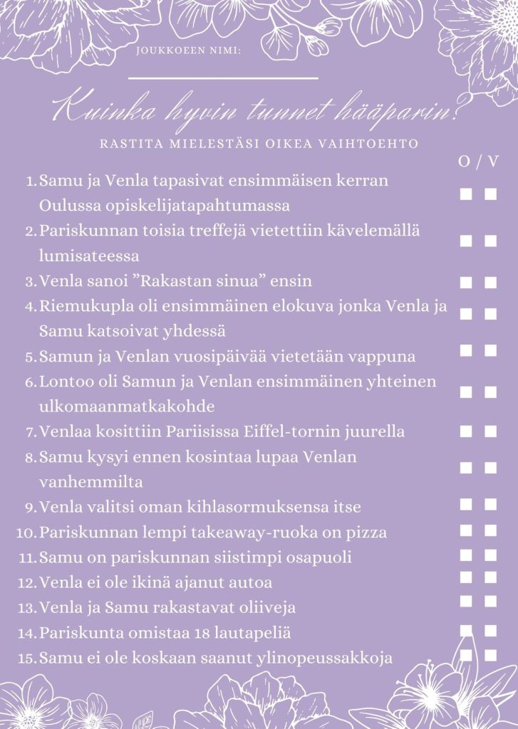 Häiden ohjelman ja aikataulun suunnittelu on varmasti tuottanut päänvaivaa monelle muullekin hääparille. Mielestäni se oli yksi hääsuunnittelun haastavimpia vaiheita, koska on vaikea löytää tasapaino sen välille, onko ohjelmaa liikaa vai liian vähän. Me ratkaisimme tämän ongelman sillä, että toteutimme osan hääleikeistä yhdessä ja osa oli itsenäisesti tehtäviä. Näin vieraat saivat itse päättää halusivatko osallistua enempää hääleikkeihin. Yhteen päivään mahtuu kuitenkin yllättävän vähän ohjelmaa ja jälkikäteen minusta tuntuu, että meillä sitä oli vähän liikaakin. Perinteisen hääohjelman lisäksi hääleikkejä ei siis olisi tarvinnut olla niin paljon.