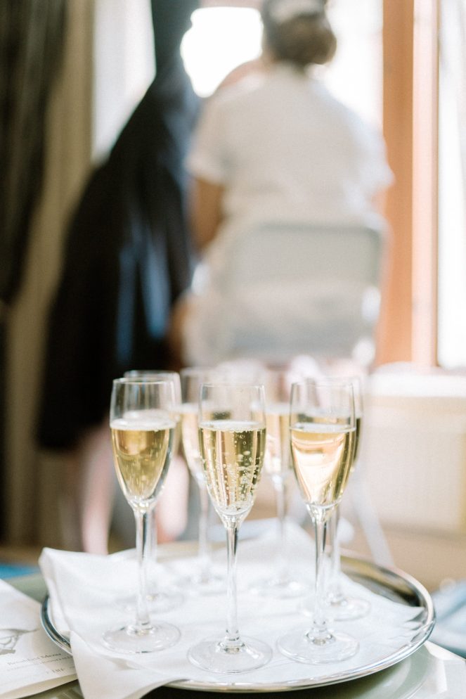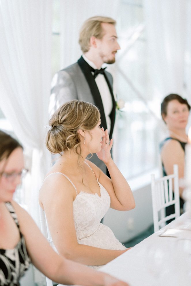 Muutaman nopean kuvan jälkeen siirryimme takapihalle kohottamaan maljaa. Meillä oli suunnitelma, jonka mukaan kuvaaja saisi jäädä saliin maljan ja alkusanojen ajaksi ottamaan kuvia. Minulle oli tärkeää saada ikuistettua juhlan yksityiskohdat ja juhlasalin koristeet ennen kuin vieraat pääsevät näkemään ne. Olin tehnyt suunnitelman maljapuheesta ja alkusanoista, jotka olivat bestmanin vastuulla. Vielä edeltävänä päivänä kaasoni oli tulostanut näitä ”käsikirjoituksia” ja jakanut ne kahdelle bestmanille. Lopulta meni kuitenkin niin, että puhuttuaan muutaman lyhyen lauseen verran bestman ohjasi vieraat onnittelujonoon. Olin tästäkin todella harmistunut, sillä olin käyttänyt puheen suunnittelemiseen aikaa ja olin uskonut kehittäneeni mestarisuunnitelman kuvaajan työn helpottamiseksi. Kun siirryimme terassille onnittelujonoon, kuiskasin hätäisesti kuvaajallemme, että suunnitelma meni näköjään heitolla uusiksi. Pahoittelin, ettei hän saanutkaan lupaamaani 10-15 minuuttia kuvaamiseen vaan suunnilleen 5 minuuttia. Onneksi meillä oli ihana kuvaaja, joka lohdutti minua, että hän ehti napsia ihan mukavasti kuvia lyhyessäkin ajassa.