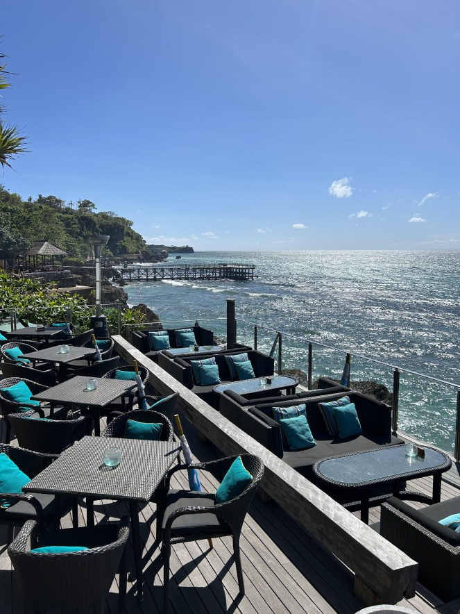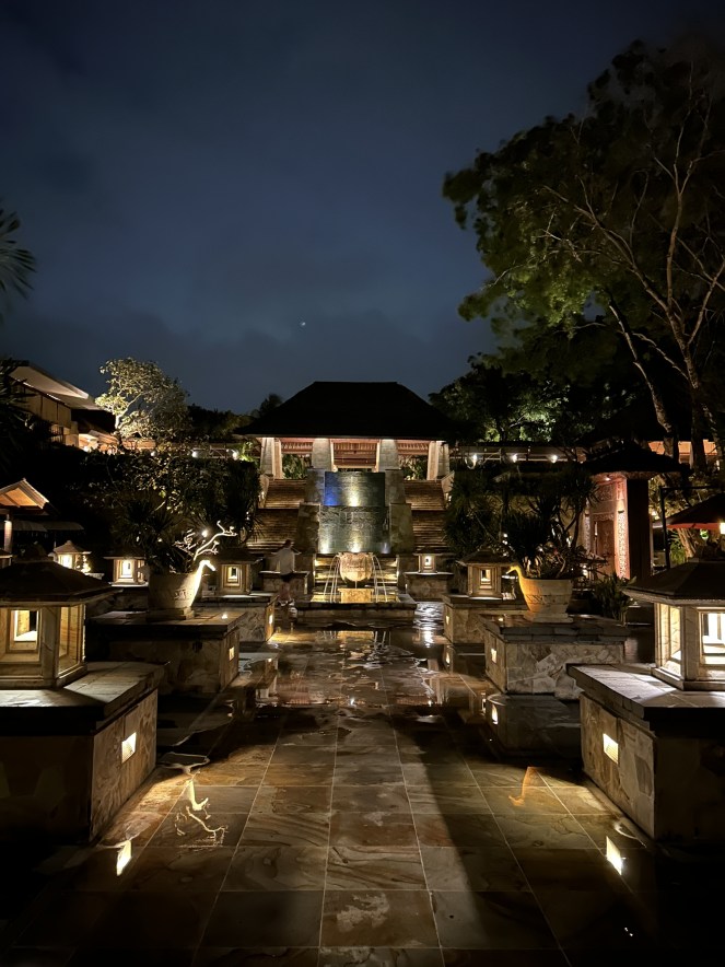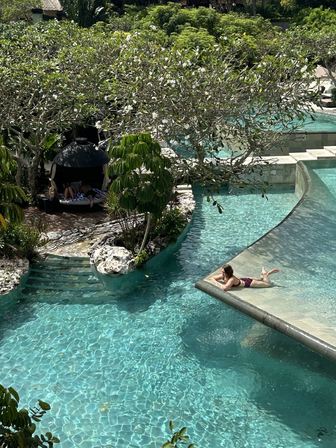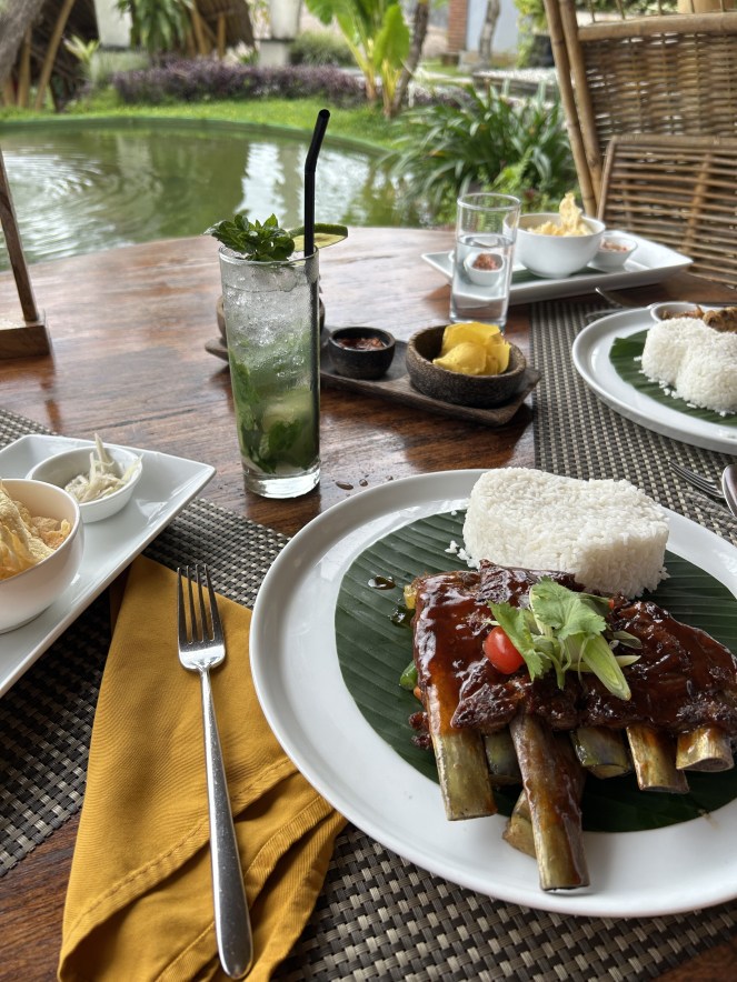 Söimme lähes joka ilta hotellin alueella eri ravintoloissa. Se oli tietysti kalliimpaa kuin Balilla syöminen yleisesti. Meidän hotellimme läheisyydessä ei kuitenkaan ollut juurikaan mitään muuta kuin muita hotelleja, joten emme lähteneet kävellen tutkimaan ympäristöä. Paikallisetkaan eivät suositelleet sitä, joten viihdyimme mukavasti oman hotelliketjumme alueella. Teimme kuitenkin kaksi päiväretkeä pois hotellin alueelta. Ensimmäinen oli hotellin kautta varaamamme matka Ubudiin paikallisen turistioppaan kanssa. Toinen oli Airbnb:n kautta varaamamme matka Nusa Penida -saarelle, johon kuului meno-paluukyydit hotellilta satamaan, veneellä saarelle ja siellä kiertoajelu suosituimpiin nähtävyyksiin. Lähtöpäivänä käytimme myös ilmaiset kupongit hotellin thalassoterapia-altaalle, mikä oli hauska kokemus.