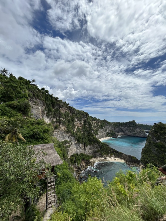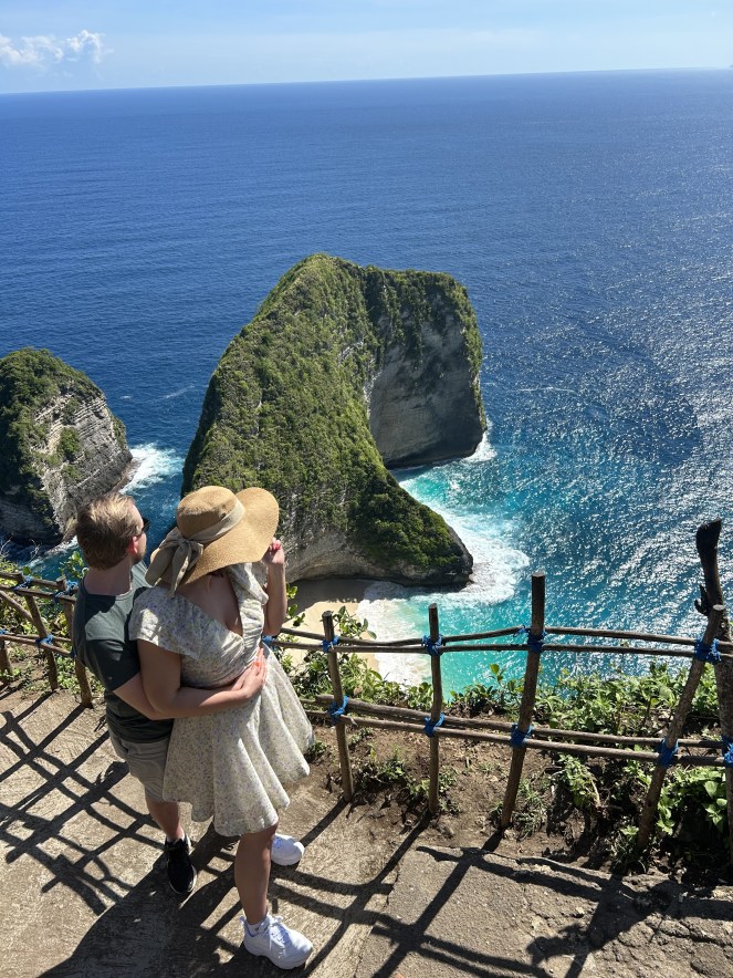 Olimme hieman kiukkuisia tämän kokemuksen jälkeen, kun kuski vei meidät syömään johonkin ravintolaan, joka oli täynnä turisteja. Ruoka oli ihan kelvollista ja meistä oli mukava istua alas kylmälle juomalle. Viimeisenä aktiviteettina meidät vietiin katsomaan Kelinking-rantaa. Senkin näimme ihan vain ylhäältä ja saimme muutaman yhteiskuvan. Olisin halunnut kävellä portaita kauemmas, mutta meillä ei kuulemma ollut aikaa. Takaisin ajaessa meillä olikin kauhea kiire ja kuski ajoi niin nopeaa kuin uskalsi. Me olimme taas kerran pahoinvoivia ja lisäksi väsyneitä ja ärtyneitä. Ehdimme juuri ja juuri viimeiseen Balille suuntaavaan veneeseen. Takaisin satamasta saimme vielä kyydin hotellille. Ehkä ongelmana oli ollut alusta alkaen huono kommunikointi matkantarjoajan kanssa, mutta jostain syystä kukaan ei ollut tajunnut varmistaa meiltä päivän suunnitelmaa etukäteen. Airbnb-ilmoituksessa oli lukenut lyhyesti ja ytimekkäästi vain aikataulut ja nähtävyydet joita päivän aikana pääsisi katsomaan. Kaikenkaikkiaan ei todellakaan kokemisen arvoinen reissu.