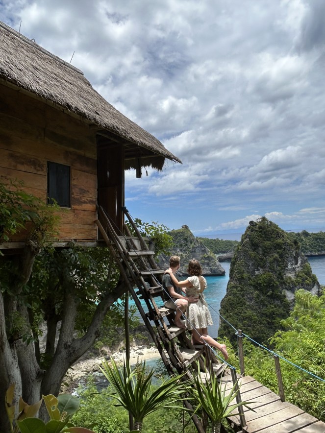 Pysähdyimme ensimmäisenä Diamond beachille, jonne emme päässeet edes alas asti. Olisin halunnut mennä, mutta kuski sanoi ettei meillä valitettavasti ole aikaa. Saimme muutaman pikaisen yhteiskuvan portaiden yläpäässä ja sen jälkeen hyppäsimme takaisin autoon. Seuraava kohde oli Instagtamista kuuluisa puumaja nimeltään Rumah Pohon Treehouse. Tässä vaiheessa molempien fiilis lähti syöksylaskuun. Ulkona oli ehkä 28 lämmintä ja auringossa seisoessa se tuntui 35 asteelta. Emme olleet ihan varmoja mihin jonotimme, mutta yhdessä muutaman kymmenen turistin kanssa seisoskelimme ja vuoroin istuimme muutaman puun alla jonottamassa noin 3 tuntia. Lopulta tuli meidän vuoromme ottaa Instagram-kuva puuhökkelin kanssa. Emme olisi ikinä suostuneet jonottamaan niin pitkään, jos olisimme tienneet. Se oli suorastaan naurettavaa. Kysyimme odottamisen välissä kuskilta, että vieläkö kestää kauan ja minusta tuntui että hän suoraan valehteli meille vakuuttaessaan että puoli tuntia. Sen jälkeen vielä odotimme 1,5-2 tuntia ennen meidän vuoroamme. Saimme 5 minuuttia aikaa ottaa kuvia kunnes oli seuraavan vuoro.
