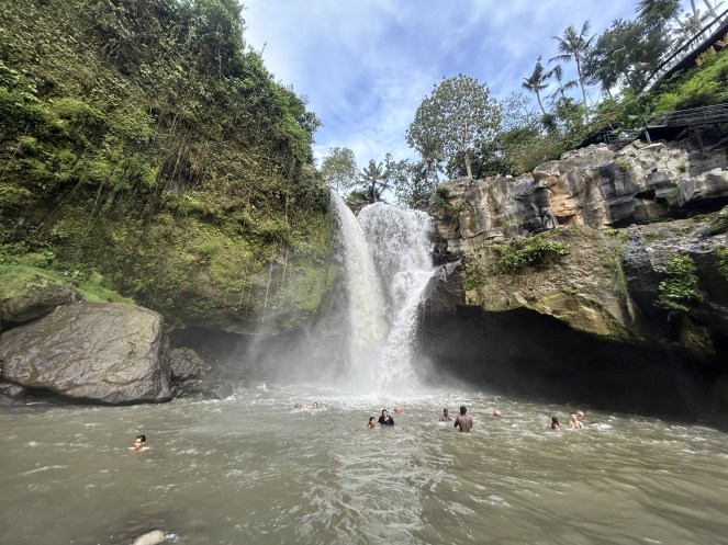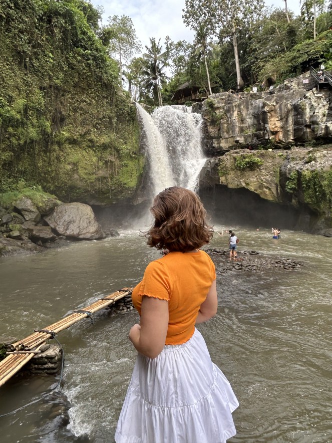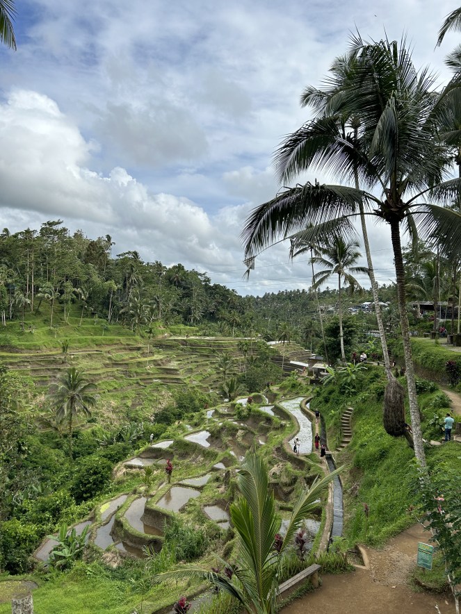 Meidän pyynnöstämme saimme tämän jälkeen hetken aikaa kaksistaan Ubud Marketin tutkimiseen. Ostin sieltä itselleni boheemin rantahameen ja -housut. Sen jälkeen opas vei meidät syömään johonkin ravintolaan, jonka kanssa hänellä oli selkeästi jonkinasteinen sopimus. Ruoka oli hyvää vaikkakin todella tulista ja näköalat viidakkoon upeat, joten meillä ei ollut valittamista. Ruokailun jälkeen pääsimme käymään Tegallalang-riisiterasseilla, mistä pidimme molemmat eniten koko päivän aikana. Opas osasi kertoa meille paljon tietoa riisin viljelemisestä ja terassien muodostumisesta. Tämän jälkeen aloitimme matkan takaisin hotellille. Meidän toiveestamme pysähdyimme lyhyesti Tegenungan-vesiputoukselle ennen kuin jatkoimme matkaa perille hotellille.