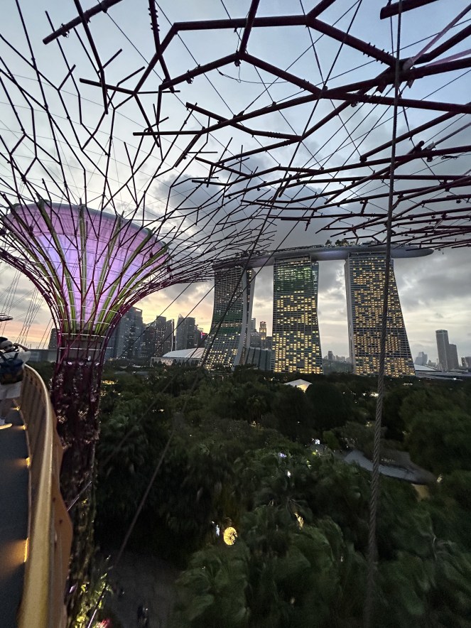 Illalla lähdimme testaamaan Hawker Chanin eli maailman halvimman Michelin-tähden illallisen (jälkikäteen sain tietää että annoksella ei enää ole Michelin-tähteä). Ruoka oli todella hyvää ja kokemisen arvoista, vaikka se ei näytäkään kummoiselta. Koko kana-riisiannokselle hintaa tuli vain 5 euroa! Illallisen jälkeen halusimme vielä päästä näkemään Gardens by the Bay:n ja valoshow’n. Se oli Singaporen reissun kohokohta, joka ei pettänyt vaan jopa ylitti odotukset. Valoshow’n teema vaihtuu useamman kerran vuodessa ja me saimme ihailla ”Garden Waltz” -näytöstä, joka aiheutti kylmiä väreitä meissä molemmissa. Suurin osa kävijöistä ihaili valonäytöstä alhaalta käsin istuen ja makoillen maassa katse taivaalle. Me olimme ajoittaneet käyntimme niin, että olimme ylhäällä OCBC Skyway:lla kun valoshow alkoi. Itse näytös oli ilmainen, mutta Skyway:n pääsylippu maksoi 12 Singaporen dollaria yhdeltä aikuiselta.