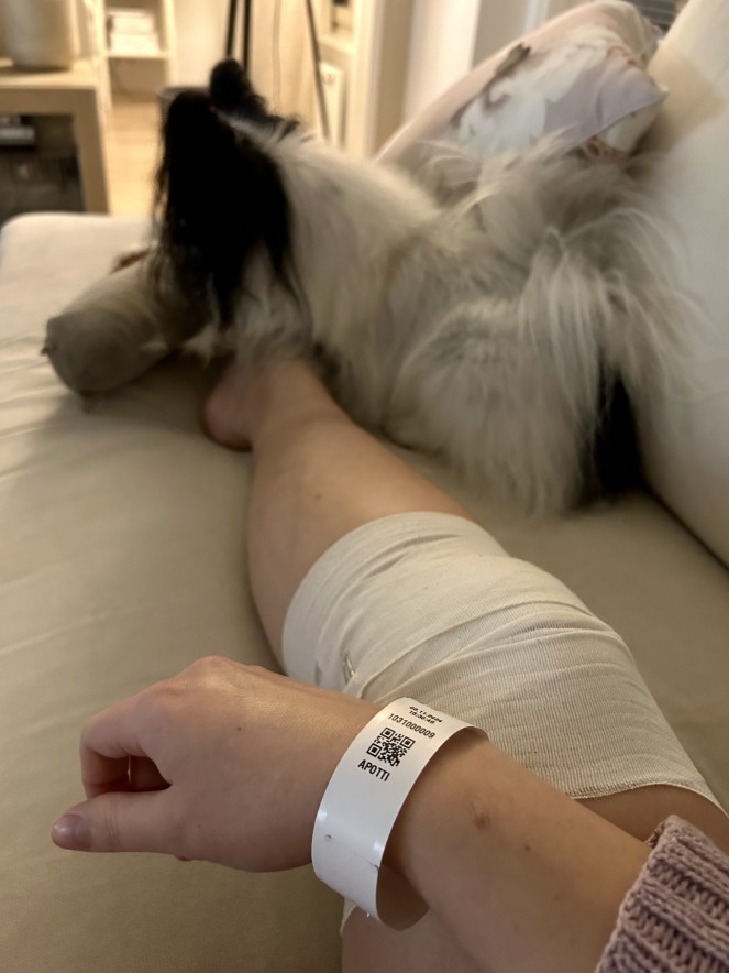 Myöhemmin samalla viikolla koimme pelottavan hetken, kun illalla ulkona kävellessäni kompastuin jalkakiveykseen ja kaaduin maha edellä asfalttiin. Onneksi ehdin ottaa käsillä ja polvilla vastaan sen verran että maha sai vain kevyen osuman. Soitin heti naistenklinikan päivystykseen josta pyydettiin tulemaan paikan päälle. En ollut kaukana kotoa, joten Samun kanssa pääsimme nopeasti autolla keskustaan. Minut otettiin lyhyen odotuksen jälkeen sisään ja laitettiin kiinni KTG-laitteeseen, jolla seurattiin vauvan sykettä. Syke löytyi helposti ja oli rauhoittavan tasainen koko tunnin ajan kun sitä seurattiin. Onneksi kaatumisesta ei siis seurannut mitään vakavampaa kuin ruhjoutunut polvi.