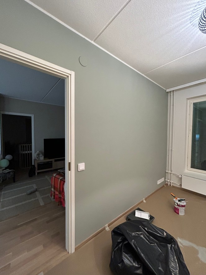 Olimme pyytäneet siskoani auttamaan meitä lastenhuoneen maalausprojektissa, koska olimme päättäneet maalata yhden neljästä seinästä vihreäksi. Hän tuli meille raskausviikon 37 alussa ja hoiti homman puolestamme, koska hänellä oli paljon enemmän kokemusta maalaamisesta ja itse halusin välttää maalihuuruja parhaani mukaan. Sävyksi valitsimme Tikkurilan Serpentiinin, joka oli kaunis harmahtavan vihreä. Lastenhuone viimeisteltiin 1,5 viikkoa myöhemmin pinnasängyllä, mutta loput tammikuun alussa tilaamamme huonekalut eivät ehtineet tulla ajoissa. Ne saapuivat ja kasattiin vasta pari päivää vauvan syntymän jälkeen. Sitä ennen kaikki vauvanvaatteet ja -tarvikkeet säilytettiin suurissa muovilaatikoissa.