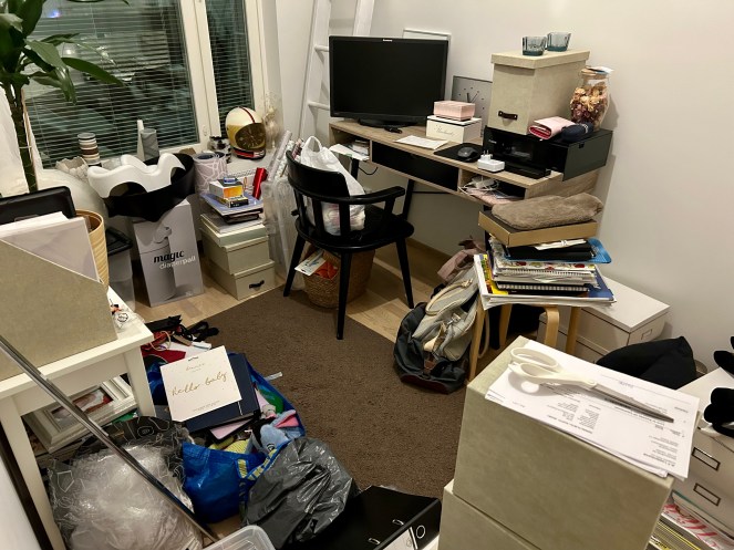 Kunnon pesänrakennusvaihe alkoi joulukuun alussa noin viikolla 30, kun teimme lopullisen päätöksen ottaa asuntomme pois myynnistä. Halusimme riittävästi aikaa valmistautua vauvan tuloon ilman mahdollisen muuton aiheuttamaa stressiä. Meillä oli jo heti raskauden alusta ollut suunnitelmissa muuttaa työhuone osittain lastenhuoneeksi, mikäli päätyisimme jäämään nykyiseen asuntoomme. Aloitimme projektin käymällä asuntoa läpi huone kerrallaan ja karsimalla pois kaikki turha tavara. Saimme kasaan useamman laatikollisen kirpputorille vietävää tavaraa ja samalla myimme vanhoja huonekaluja vauvan huonekalujen tieltä. Projekti eteni parissa viikossa hyvin niin että joululomalle lähtiessämme jäljellä oli enää työhuoneen ja keittiön kaappien organisointi.