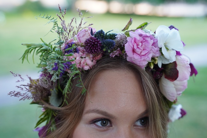 Kesän lähestyessä Ilona vahvisti minulle, että saamme ihanaan kuvaustiimiimme floristiksi taitavan Tanjan Floramorelta. Jos olette seuranneet yhtään häämediaa, olette varmasti nähneet Tanjan upeita luomuksia Instagramissa ja muiden hääbloggaajien blogeissa. Jo alusta asti minulla oli haaveissa kukkaseppele videoon ja Tanja oli mielellään mukana toteuttamassa sitä. Minulla ei ollut kuitenkaan kovin selkeää visiota, joten luotin vakaasti Tanjan ammattitaitoon. Lopputulos olikin aivan upea!
