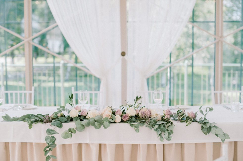 Hirvihaaran kartanon lasipaviljonki on upea ja juhlava ihan sellaisenaan eikä loistavien kattokruunujen seuraksi tarvita juuri muita koristeita. Vuokrasimme kuitenkin muutamat tarpeelliset koristeet häitämme varten Cosa Nostra Crew:lta (kyntteliköt) ja Annen Party & Deco:lta (kaikki muut koristeet). Koristelu ei sujunut ihan ongelmitta, koska lasipaviljongissa oli häät edeltävänä päivänä ja meidän häiden koristelun pystyi toteuttamaan vasta hääpäivänä. Itse emme päässeet hääaamuna koristelemaan juhlatilaa, joten suurimman osan koristelun toteutuksesta hoiti kartanon väki. Joudun myöntämään, että koristelussa olisi voinut olla paljon parantamisen varaa. Ongelmaksi muodostui se, että jouduin luottamaan sokeasti muiden kykyyn toteuttaa visioni, eikä se mennyt ihan nappiin.